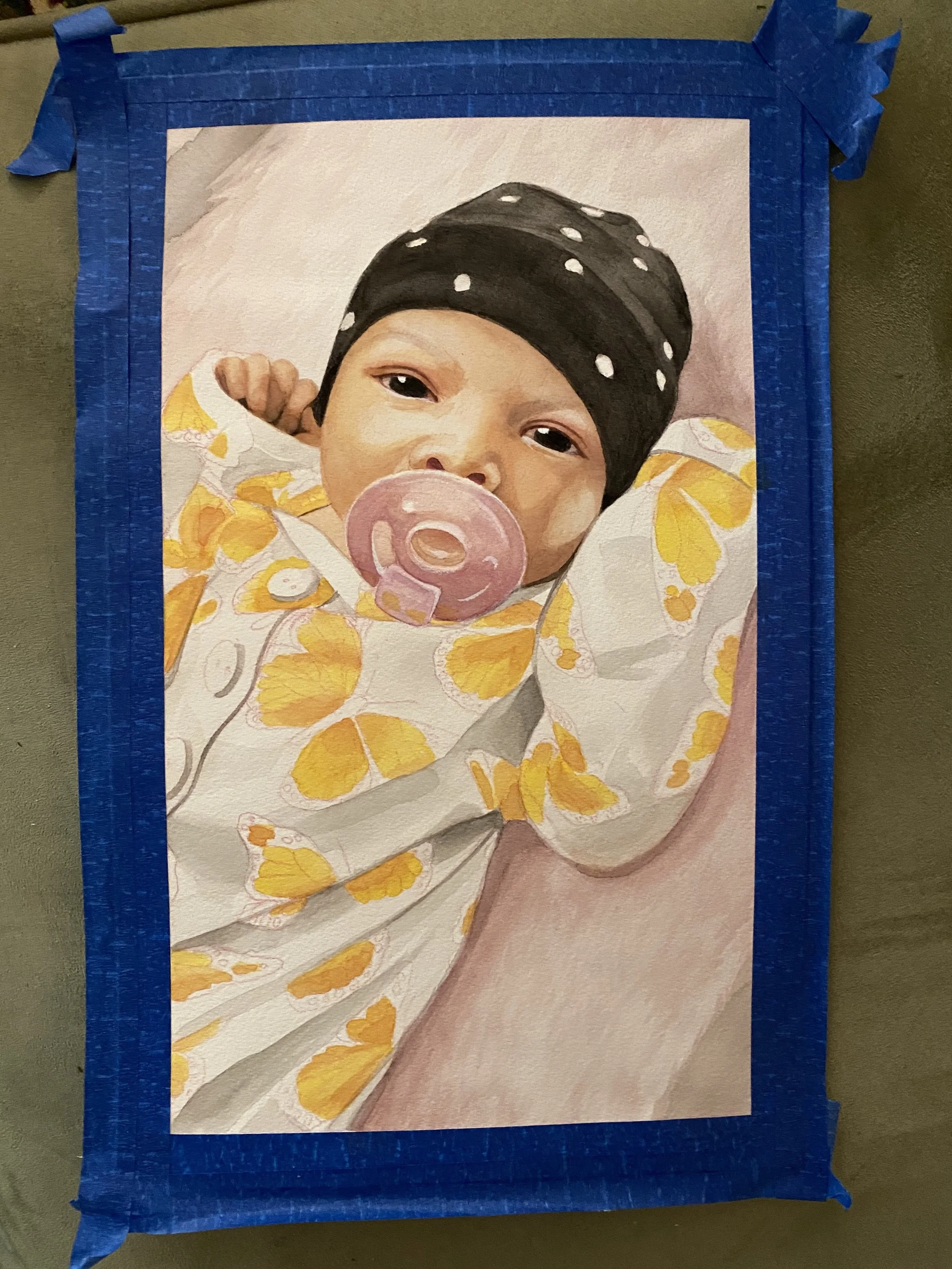 • A portrait of a newborn in her first delightful onesie at the hospital. Based on a photograph provided by the grandmother.